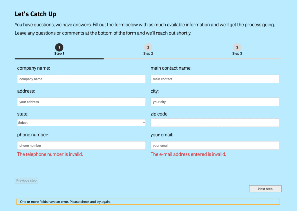 Visually, we had to break away from having the form look like it would take forever. In the previous incarnation there were tons of text inputs and radio buttons that weren’t always necessary. I used some contact form add ons to add conditional functionality and database support rather than it rerouting form information via javascript to the admin email. This means the form is only as long as it needs to be and the sales team had a place for all of their leads information.